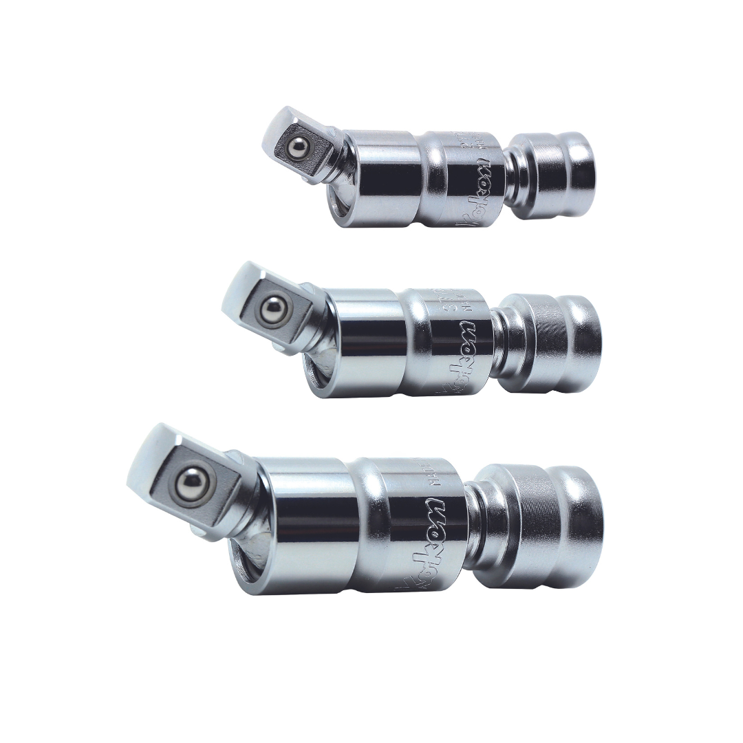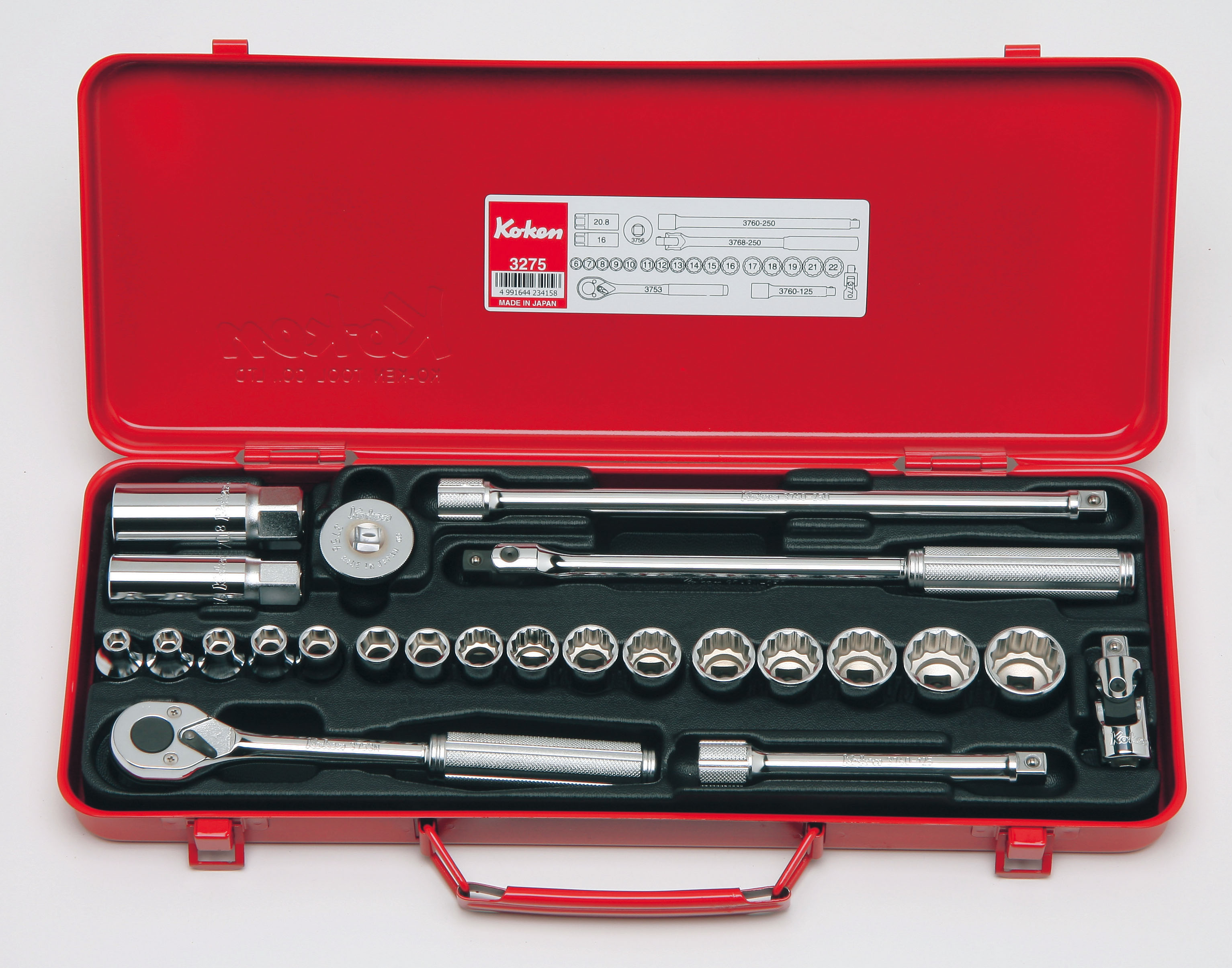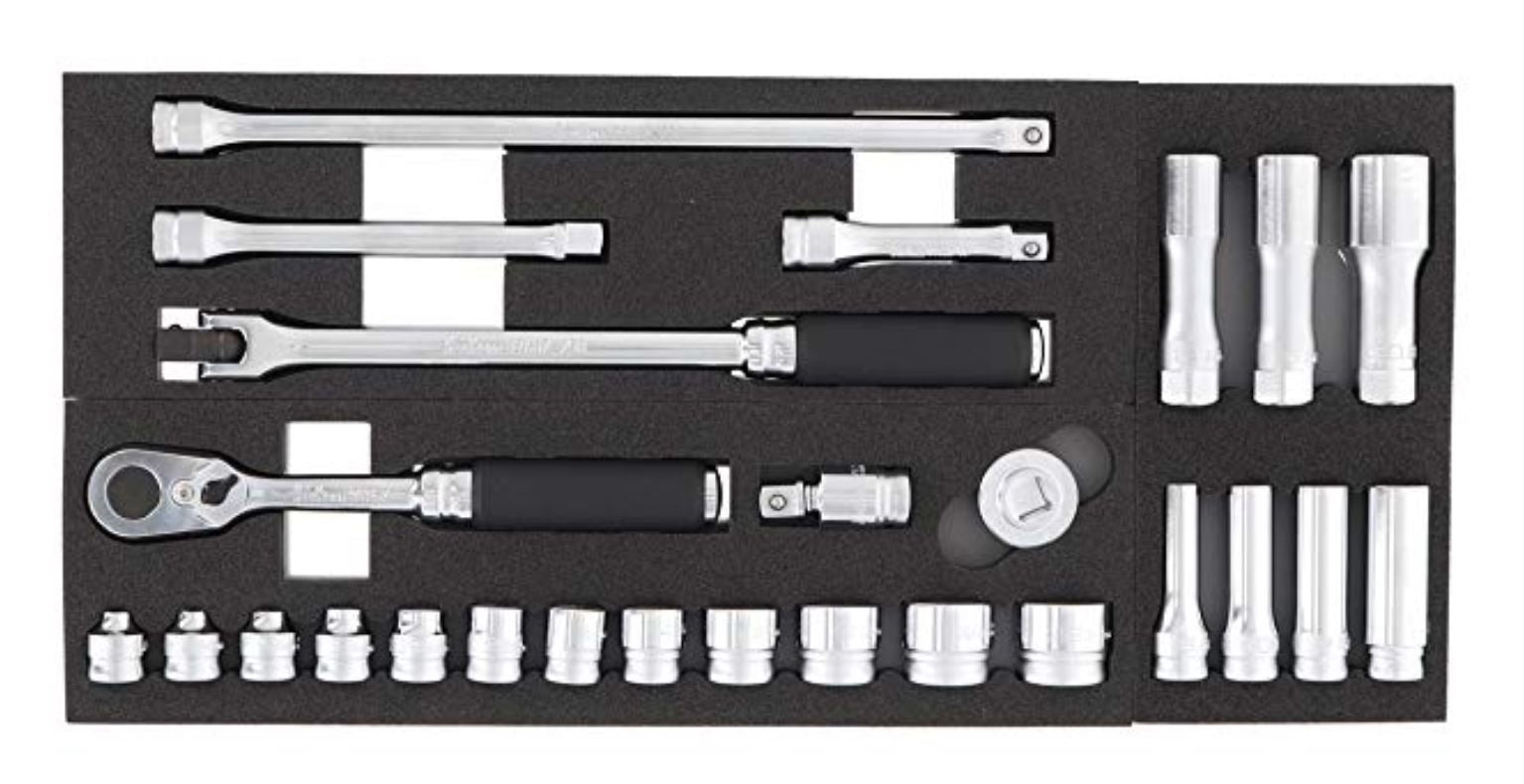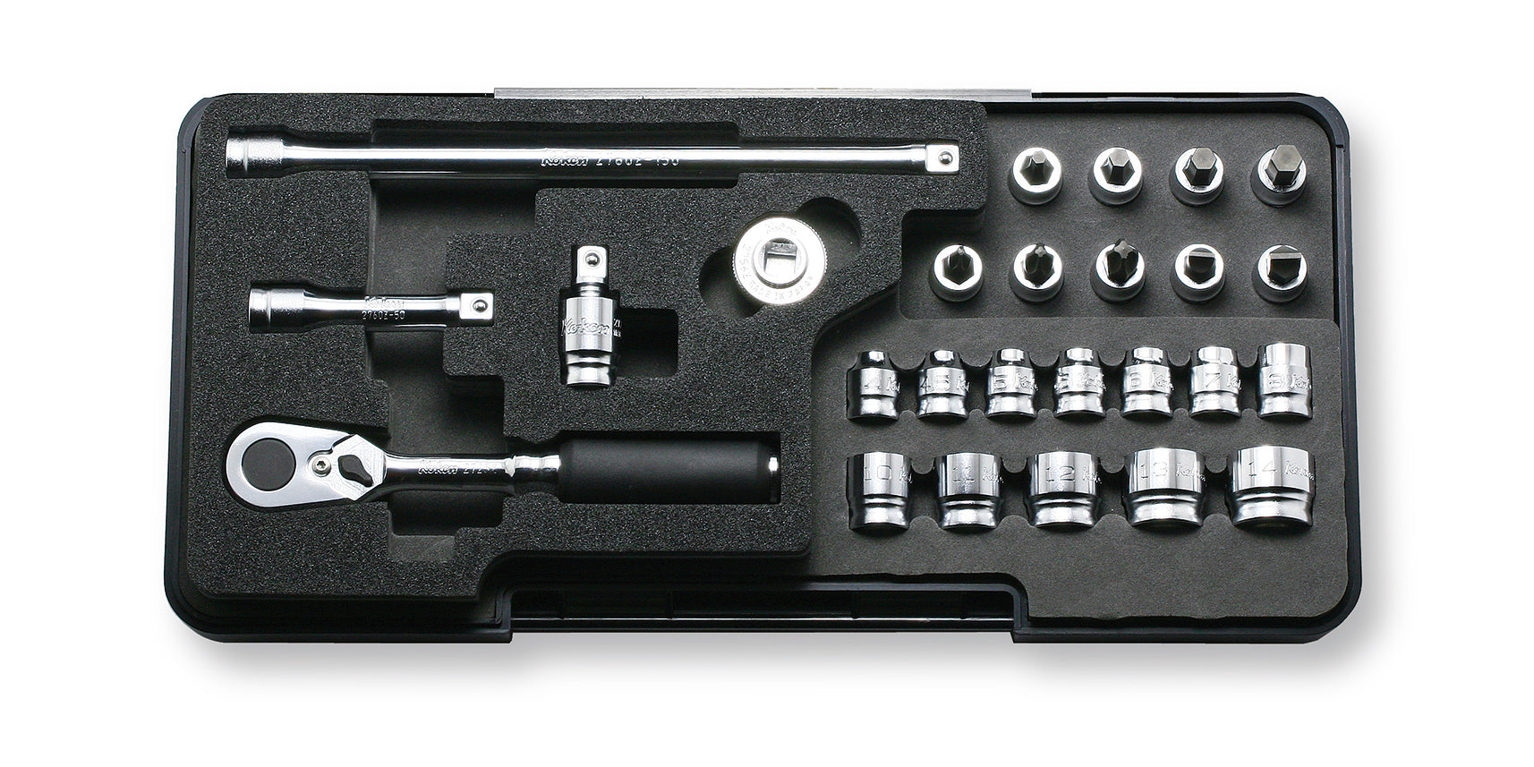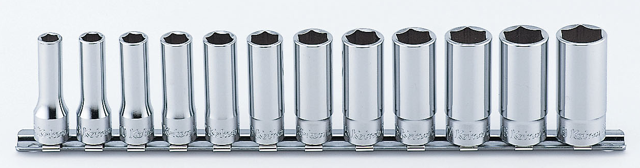 For those requiring a more extensive set, the Ko-ken 3286Z 3/8" Sq. Dr. 21-Piece Z-Series 6-Point Metric Socket Set is a high-quality, versatile toolset designed for precision and durability. It includes 3400MZ 6-point sockets in a comprehensive range of sizes (7, 8, 10, 11, 12, 13, 14, 15, 16, 17, 18, 19, 21, 22 mm), as well as 3760Z extension bars in lengths of 75, 125, and 250 mm to reach tight spaces. The set also features a 72-tooth flex-head ratchet for smooth operation, a universal joint for flexible access, and a quick spinner for fast manual adjustments. All these components are neatly organized in a durable and attractive metal case, making it a reliable choice for professionals and serious enthusiasts alike.